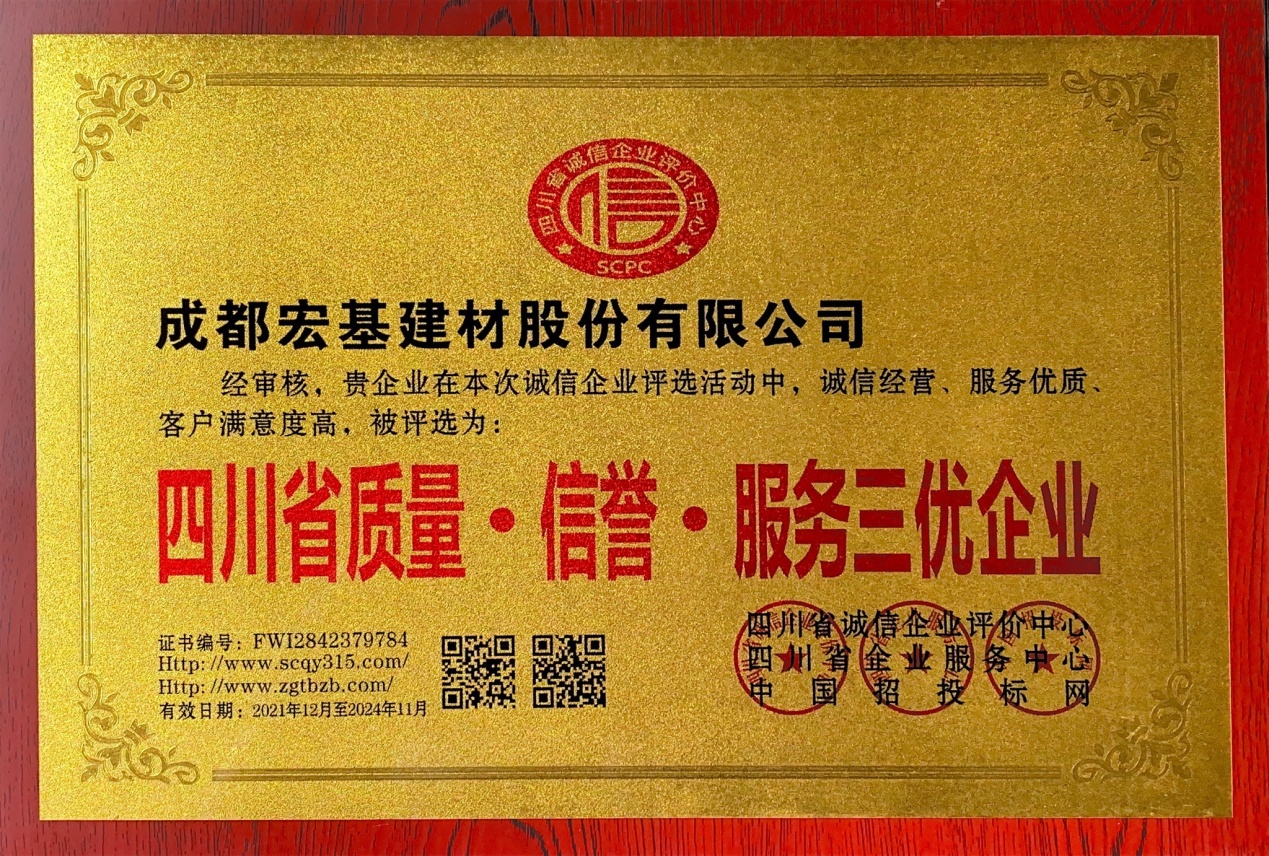 四川省誠(chéng)信評(píng)選組委會(huì)秉承“公開(kāi)、公平、公正”的原則,進(jìn)行了系列審查評(píng)選,公司在本次評(píng)選活動(dòng)中獲得了“四川省誠(chéng)信經(jīng)營(yíng)十佳優(yōu)秀企業(yè)”、“四川省質(zhì)量?信譽(yù)?服務(wù)三優(yōu)企業(yè)”、“四川省綠色環(huán)保建材優(yōu)秀示范單位”三項(xiàng)榮譽(yù)。