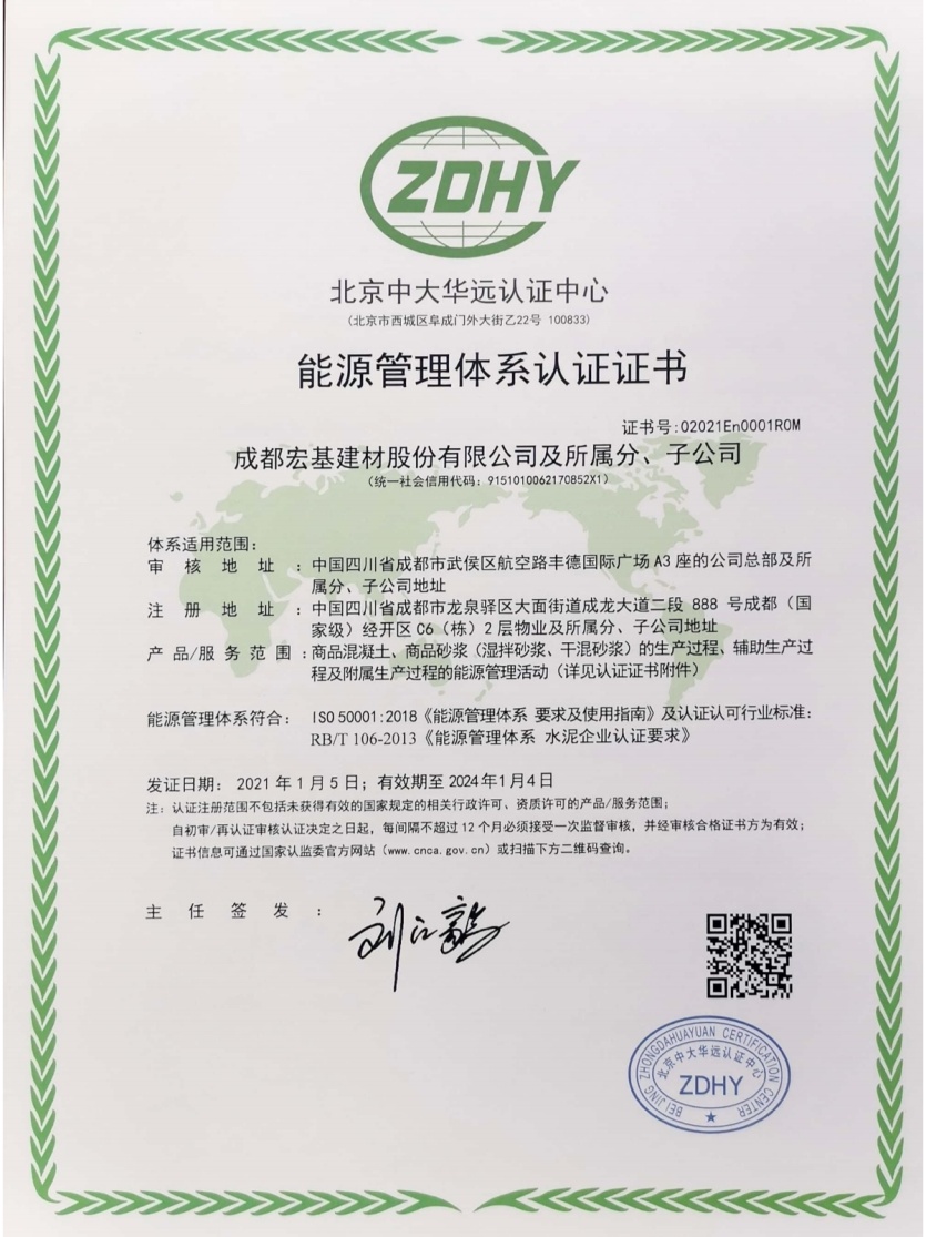 12月25日,成都宏基建材股份有限公司能源管理體系通過中大華遠公司的最終審核,順利獲得能源管理體系認證證書。