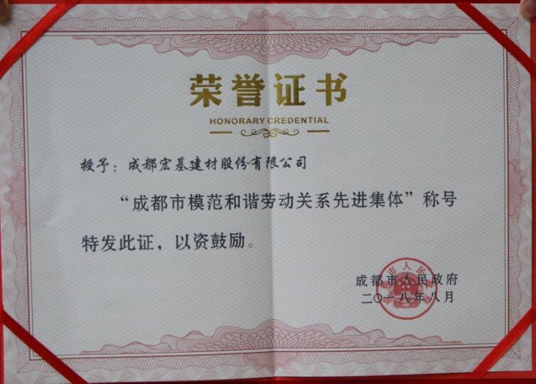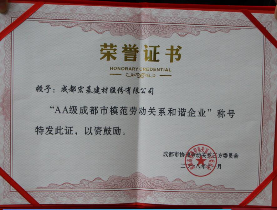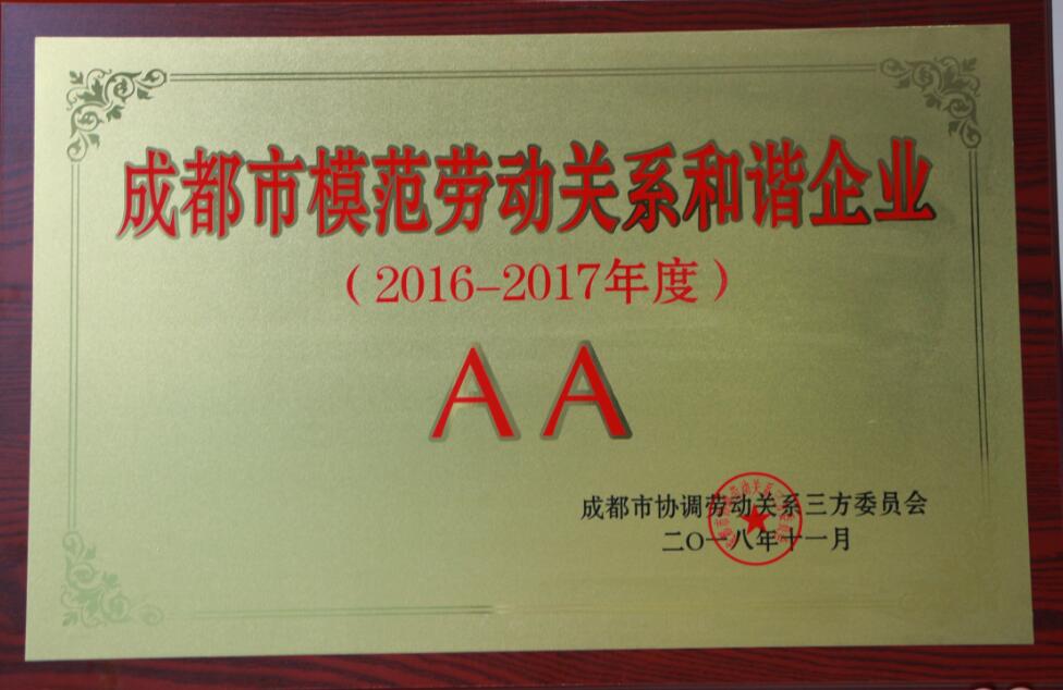 經成都市人民政府和成都市協(xié)調勞動關系三方委員會評選審定,我公司獲評“成都市模范和諧勞動關系-先進集體”和“成都市模范勞動關系和諧企業(yè)-AA級”。此次獲獎既是市政府和市協(xié)調勞動關系三方委員會對我公司的肯定,也是對我公司的鞭策。未來我們將繼續(xù)秉承“誠信、責任、創(chuàng)新” 的企業(yè)核心價值觀,進一步提高以人為本的人性化管理水平,關愛員工生活,創(chuàng)造良好的工作、學習和休息環(huán)境,造就高素質員工隊伍,提升員工歸屬感,致力于建立健全和諧勞動關系的長效機制而不懈努力。