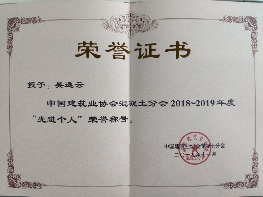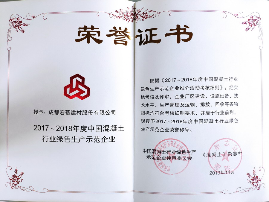 2019年11月25日至29日,由中國(guó)建筑業(yè)協(xié)會(huì)混凝土分會(huì)主辦的2019年中國(guó)混凝土年會(huì)暨混凝土行業(yè)高質(zhì)量發(fā)展論壇在廣東珠海隆重舉行,會(huì)上成都宏基建材股份有限公司再次獲得2017-2018年度中國(guó)混凝土行業(yè)綠色生產(chǎn)示范企業(yè)榮譽(yù)稱號(hào),公司董事長(zhǎng)兼總裁吳逸云先生被評(píng)為中國(guó)建筑業(yè)協(xié)會(huì)混凝土分會(huì)2018-2019年度“先進(jìn)個(gè)人”。