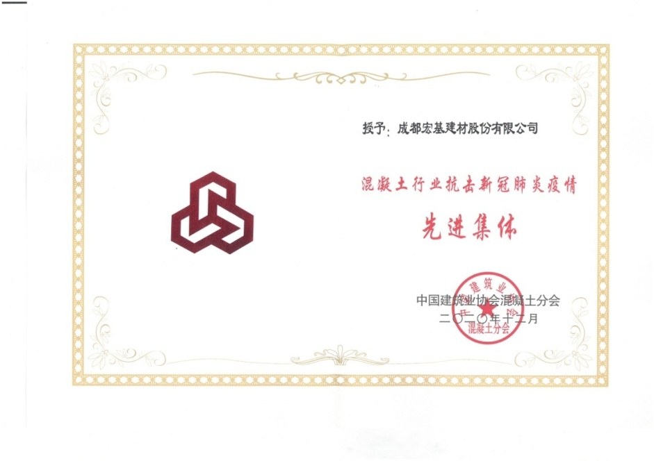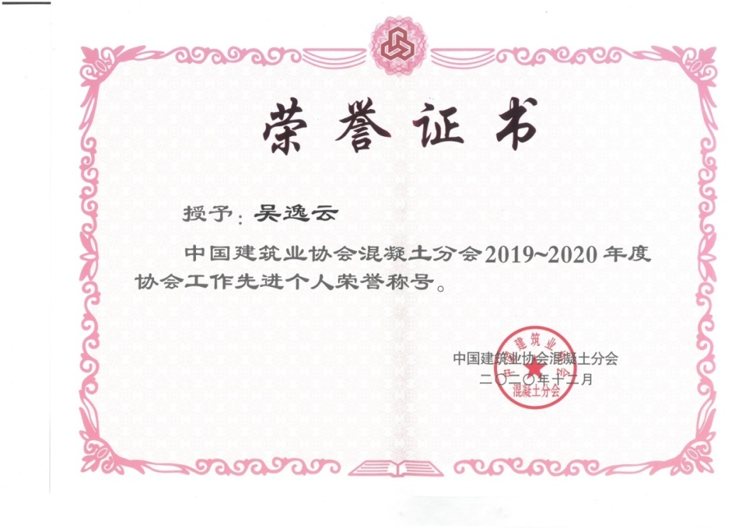 2020年12月22日-25日在沈陽召開的由中國建筑業(yè)協(xié)會混凝土分會組織舉辦的“2020年中國混凝土行業(yè)高質(zhì)量發(fā)展交流會”上,公司榮獲“混凝土行業(yè)抗擊新冠肺炎疫情先進集體”,總裁吳逸云先生獲得“先進個人”榮譽稱號。