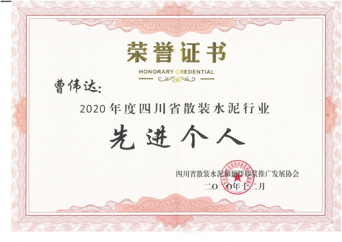 2020年12月25日,在四川省散裝水泥和預拌推廣發(fā)展協(xié)會召開的2020年度會員大會上公司被授予“優(yōu)秀企業(yè)”稱號,公司助理總裁曹偉達先生獲得“先進個人”榮譽稱號。