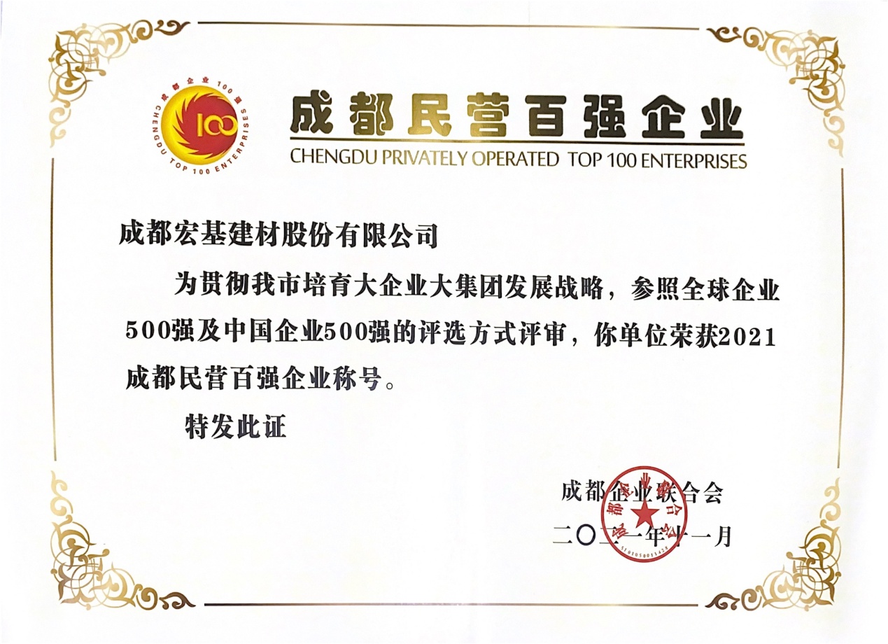 2021年,是中國共產(chǎn)黨成立100周年,也是實施“十四五”規(guī)劃的開局之年和開啟全面建設(shè)社會主義現(xiàn)代化國家新征程的第一年。為了緊扣市委市政府提出的“高質(zhì)量發(fā)展攻堅年”部署,全面實施幸福美好生活“十大工程”,開創(chuàng)成都經(jīng)濟社會發(fā)展新局面要求,成都企業(yè)聯(lián)合會開展了第十一屆百強企業(yè)評選發(fā)布。經(jīng)過專家委員嚴格評審,我司成功獲得“成都市100強民營企業(yè)”稱號。