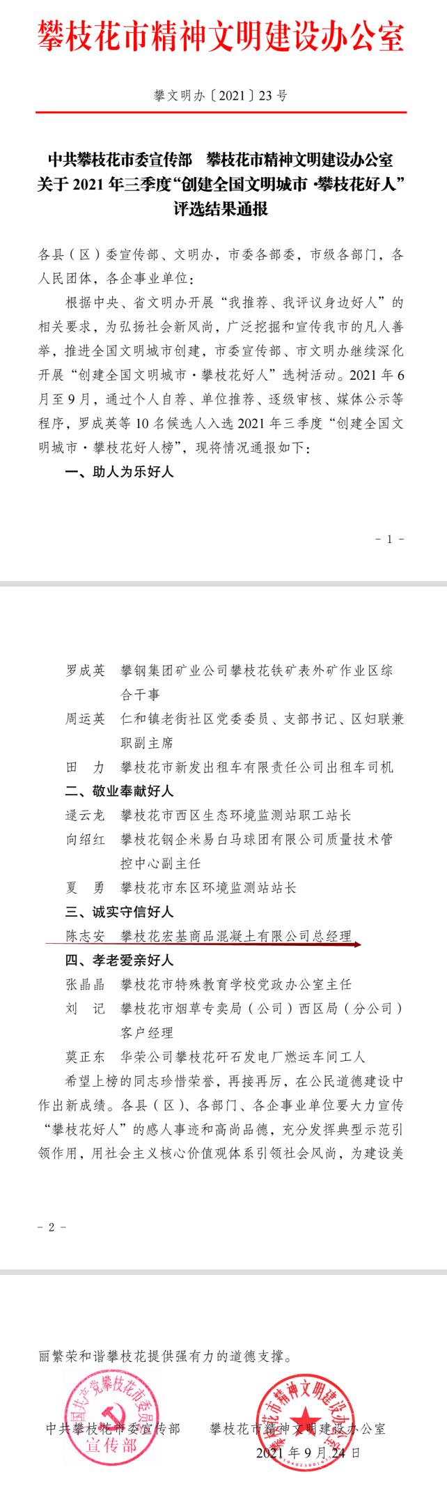 年三季度“創(chuàng)建全國(guó)文明城市·攀枝花好人榜”,成都宏基建材股份有限公司子公司攀枝花宏基商品混凝土有限公司總經(jīng)理陳志安同志獲評(píng)“誠(chéng)實(shí)守信好人”。