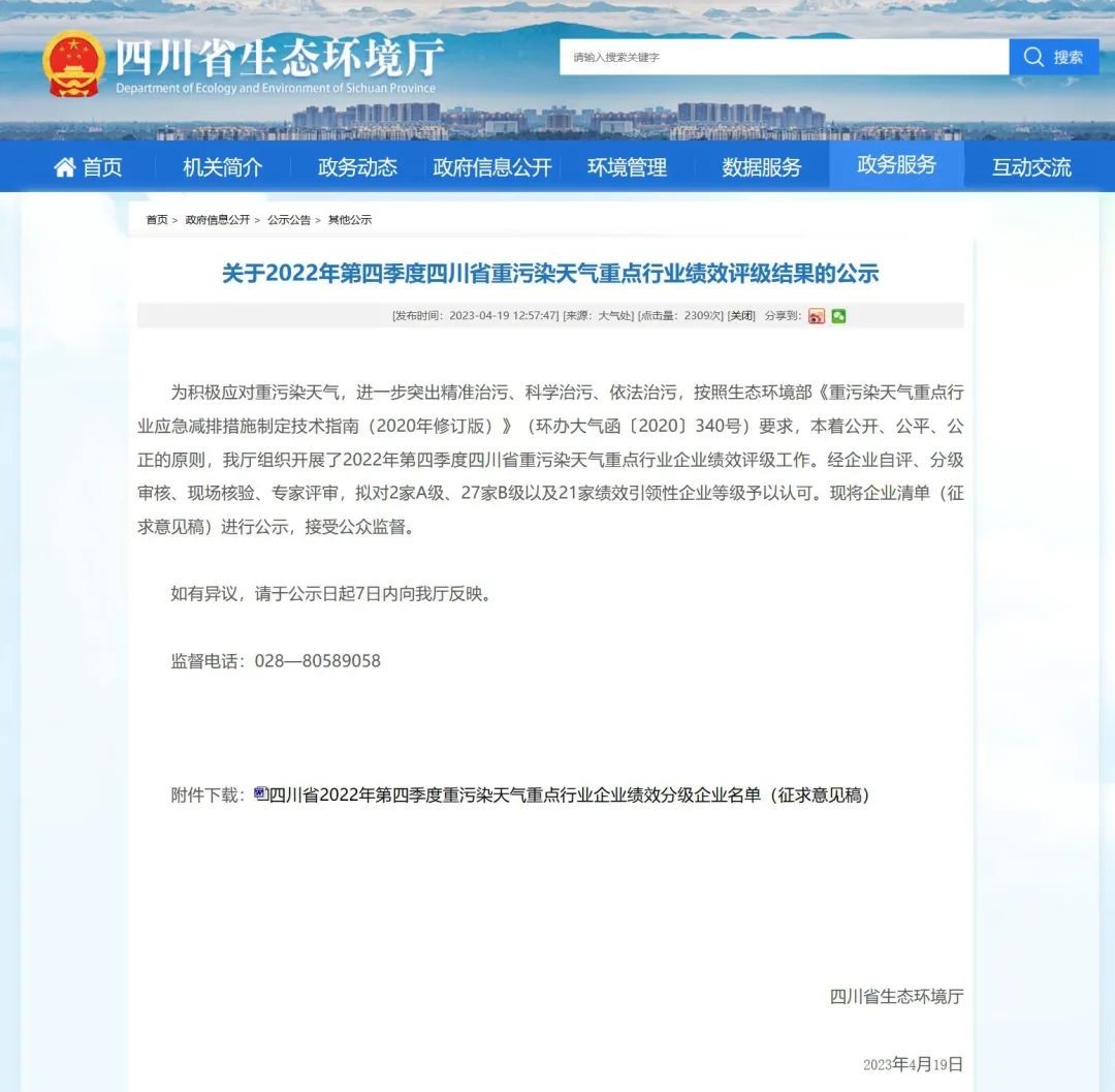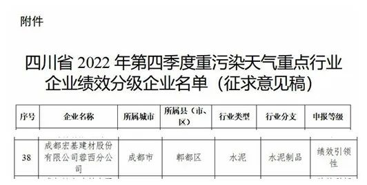 近日,四川省生態(tài)環(huán)境廳發(fā)布2022年第四季度四川省重污染天氣重點(diǎn)行業(yè)績(jī)效評(píng)級(jí)結(jié)果,我司蓉西分公司榜上有名。