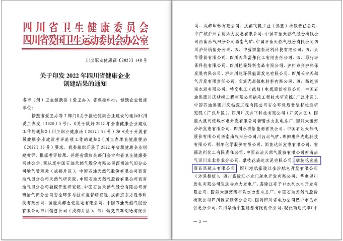 4月10日,全省通過了現(xiàn)場考評的60家企業(yè)向社會公示。5月11日,由四川省衛(wèi)生健康委員會和四川省愛國衛(wèi)生運(yùn)動委員會辦公室聯(lián)合發(fā)文公布,認(rèn)定攀枝花宏基商品混凝土有限公司等59家企業(yè)為“四川省健康企業(yè)(2023—2027年)”。