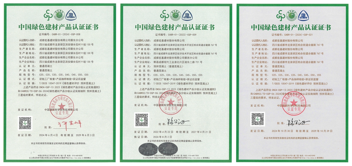 在追求可持續(xù)發(fā)展的今天,綠色建材已成為建筑行業(yè)轉(zhuǎn)型升級的重要方向。20241030日成都宏基建材股份有限公司綠色建材智造中心產(chǎn)品獲得中國綠色建材產(chǎn)品三星級認(rèn)證,自此公司在蓉三個基地(綠色建材智造中心、蓉西分公司、蓉東分公司)生產(chǎn)的混凝土產(chǎn)品均獲得中國綠色建材產(chǎn)品三星級認(rèn)證。這不僅是對成都宏基長期致力于綠色生產(chǎn)的認(rèn)可,也體現(xiàn)了我們在推動綠色建材行業(yè)發(fā)展中的積極貢獻(xiàn)。