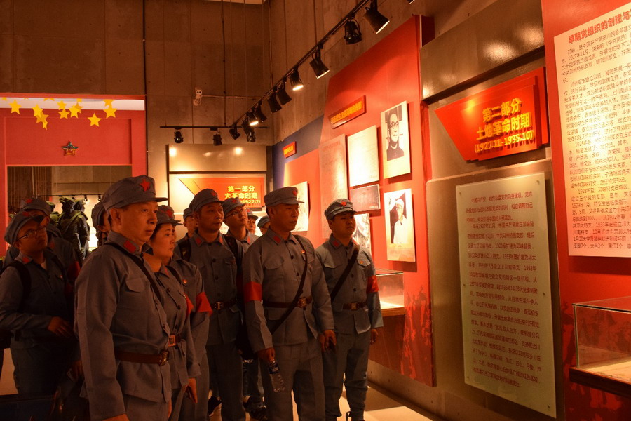 全體著裝完成后,大家整齊列隊(duì)于紅軍紀(jì)念墻前用莊嚴(yán)肅穆的默哀儀式和高亢激昂的入黨誓詞向先烈們表達(dá)了深切的懷念和崇高的敬意。隨后在導(dǎo)游的帶領(lǐng)下列隊(duì)參觀了紅軍文物陳列館。通過(guò)館藏的300余件歷史文獻(xiàn)、資料、圖表和100多件實(shí)物與展板的豐富內(nèi)容,形象直觀地再現(xiàn)了紅軍的光輝足跡。