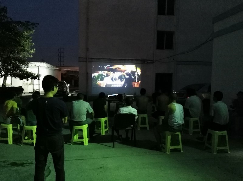 盡管此時戶外仍然驕陽似火,但放映人員一到我司就開始忙碌起來:選擇最佳放映場所、安裝和調(diào)試設(shè)備,與此同時,保安班長江有林主動幫著搬來桌子、凳子,拉起了警戒線,做著放映前的準備。漸漸地,周圍的人群慢慢多了起來,有我們分公司的員工,還有的把家屬也帶來了,大家說著笑著,期待電影的播放。