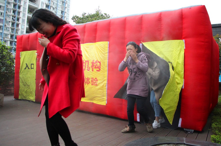 早上9:30分,豐德辦公區(qū)各部門的同事來到演練現(xiàn)場,大家都蓄勢待發(fā),模擬火災(zāi)現(xiàn)場—一頂大帳篷里面濃煙已經(jīng)彌漫整個空間,大家快速進入身臨其境體驗火災(zāi)現(xiàn)場,有的同事進入后由于煙霧彌漫無法找到出口,再次退回原路、繼續(xù)摸索“逃生”出口,慌亂、無助、緊張的氛圍充斥著體驗者的內(nèi)心,體驗結(jié)束后大家均恍若劫后余生……