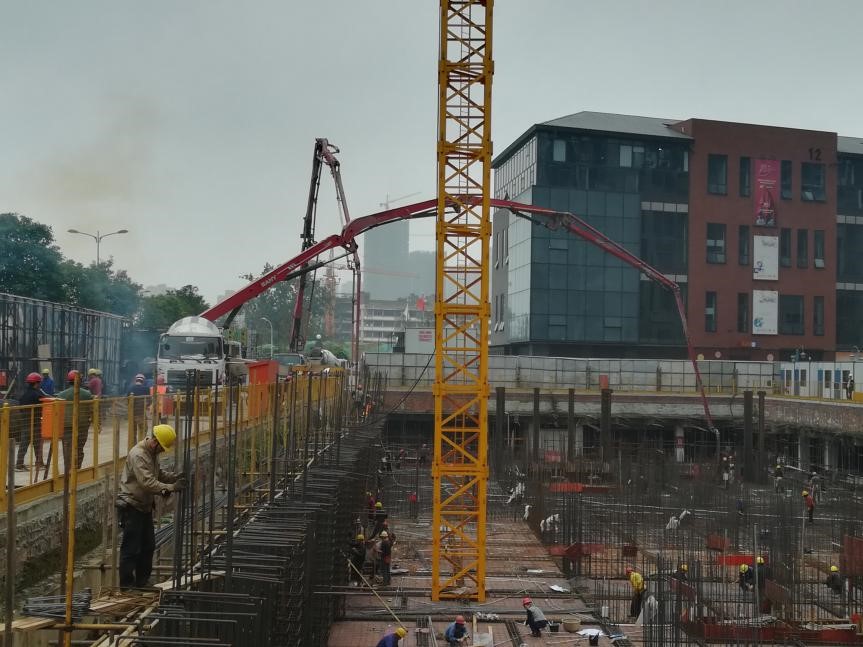 萬科金色樂府項(xiàng)目從基頂~ 26.65M墻、柱、梁全部采用C70高強(qiáng)混凝土,澆筑方式為泵送施工。2017年10月11日早上,首車C70混凝土運(yùn)輸至工地并順利泵送澆筑,當(dāng)日下午所有計(jì)劃方量全部順利澆筑完成。截止目前該項(xiàng)目共計(jì)澆筑C70泵送高強(qiáng)混凝土約1400方,混凝土和易性良好,無一堵爆管現(xiàn)象。C70高強(qiáng)混凝土的生產(chǎn)和施工得到公司以及項(xiàng)目方的高度重視,開盤現(xiàn)場公司技術(shù)副總工程師,泵送隊(duì)負(fù)責(zé)人,設(shè)備管理部負(fù)責(zé)人以及安全管理辦公室工作人員到施工現(xiàn)場進(jìn)行指導(dǎo),中心實(shí)驗(yàn)室以及蓉東分公司、金牛分公司技術(shù)質(zhì)量室主任到達(dá)現(xiàn)場學(xué)習(xí)。