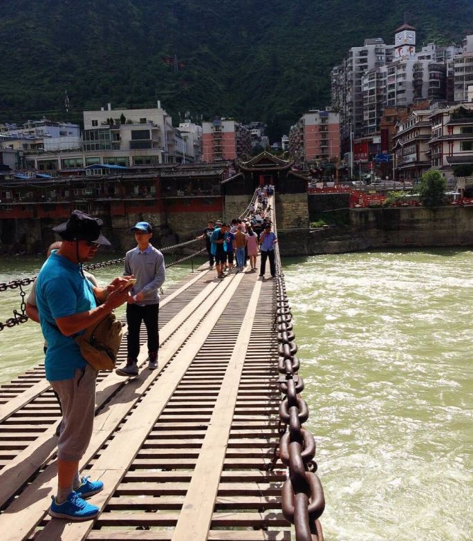 吃過(guò)早飯,我們便踏上了返程。途中我們來(lái)到了著名的紅色旅游城市——瀘定,大家上橋游覽了瀘定鐵索橋,盡管此時(shí)的橋面已經(jīng)修繕的相當(dāng)安全了,但走在上面,看到橋下洶涌的洪水,也依然覺(jué)得十分害怕,更能體會(huì)到“金沙水拍云崖暖,大渡橋橫鐵索寒”的艱難。此刻我們回顧歷史,敬仰英雄,感悟擁有和平時(shí)代的不容易。
